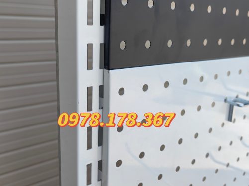 ✔ Tấm tôn đục lỗ cài móc treo được cố định bởi 02 Thanh ray đôi gắn tường có kích thước 1,2m vừa đủ cho 4 tấm lỗ. Chúng ta có thể dễ dàng lắp đặt các tấm lỗ trên thanh ray và dễ dàng ghép nối nếu muốn thêm diện tích để cài móc treo.